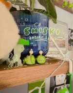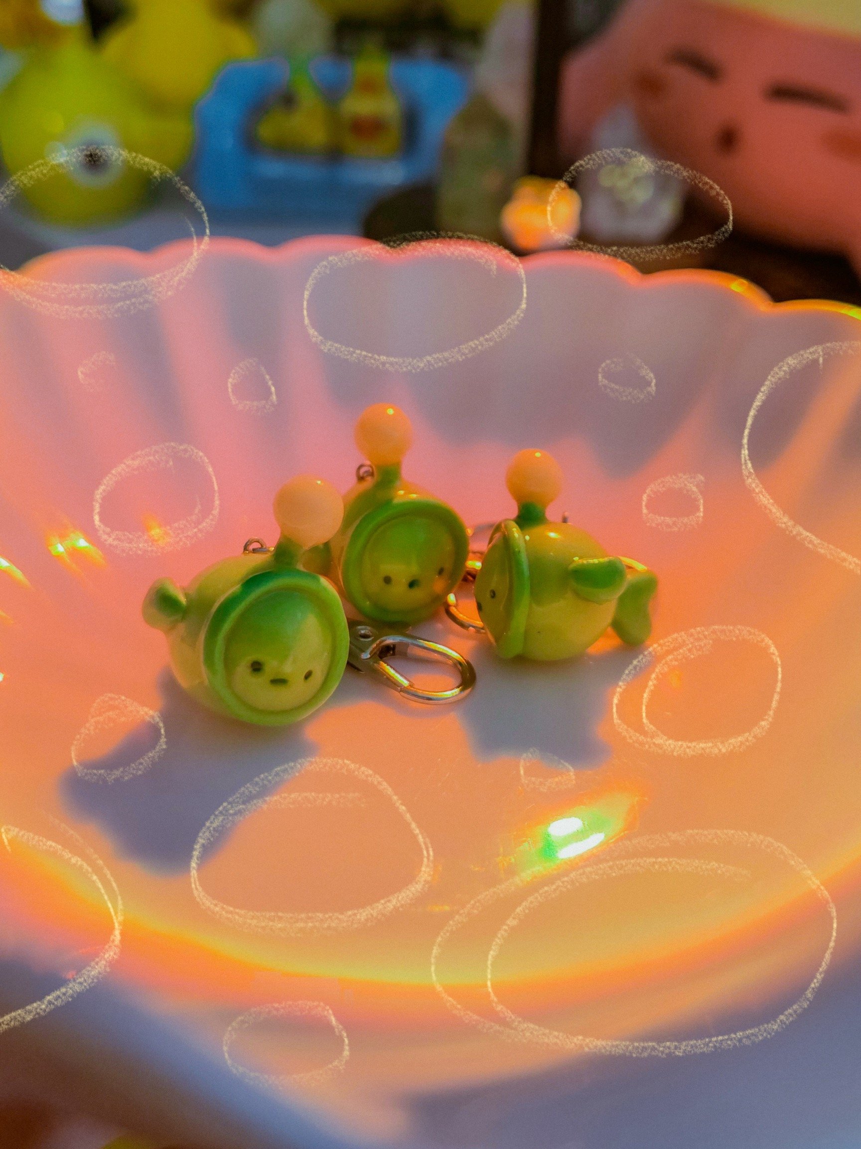 This shy little Green Guy loves to glow in the dark! It hides in the shadows with its tiny light, ready to clip onto your keys, bag, or backpack. A little buddy that shines just for you!